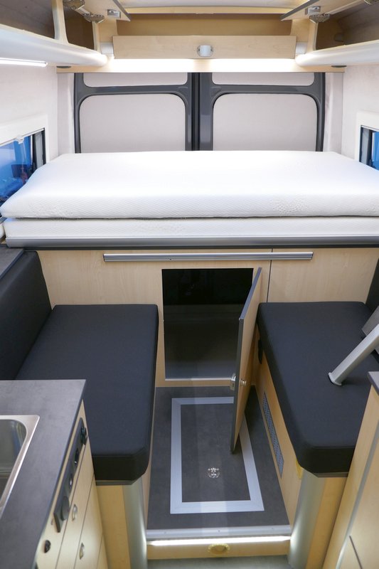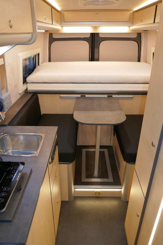 Schlafplätzen & Sitzecke mit dunklem Leder
